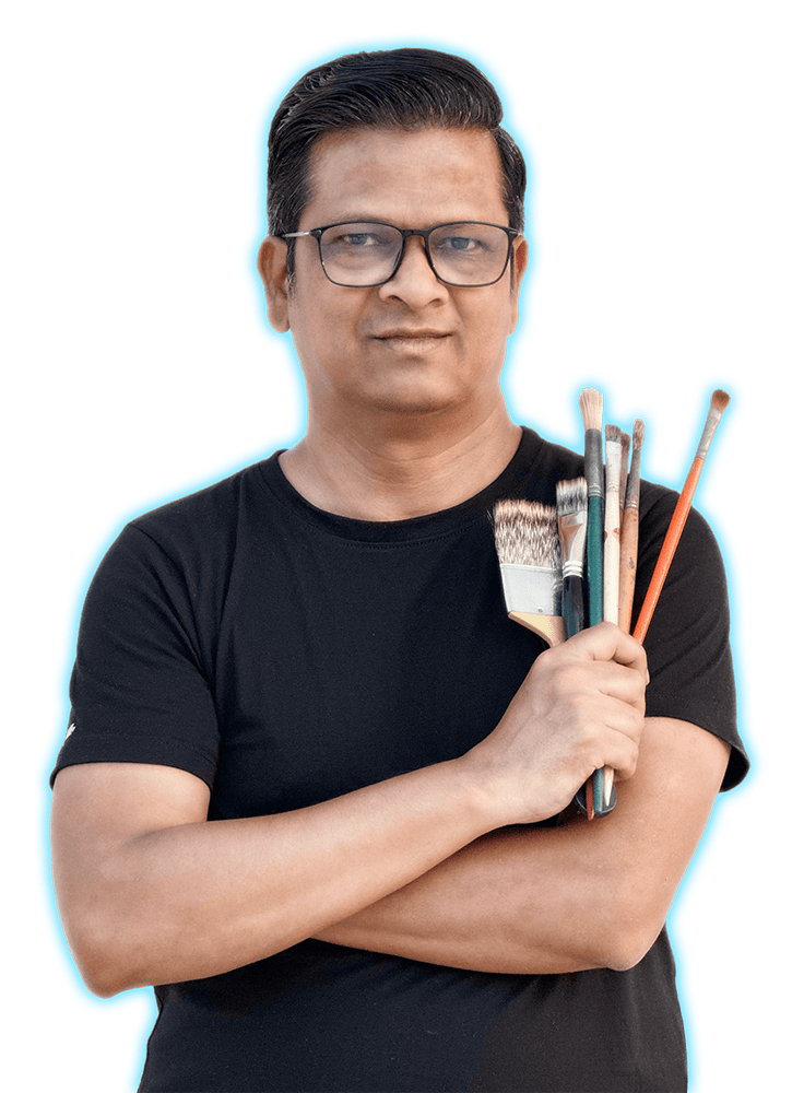 मी Santosh More — Sir J.J. School of Art Top Rank graduate, 33+ वर्षांचा अनुभव असलेला International Award-Winning Artist & Mentor. मी शेकडो Artists, Teachers आणि Students ना त्यांचं Passion, Profit मध्ये बदलायला मदत केली आहे.